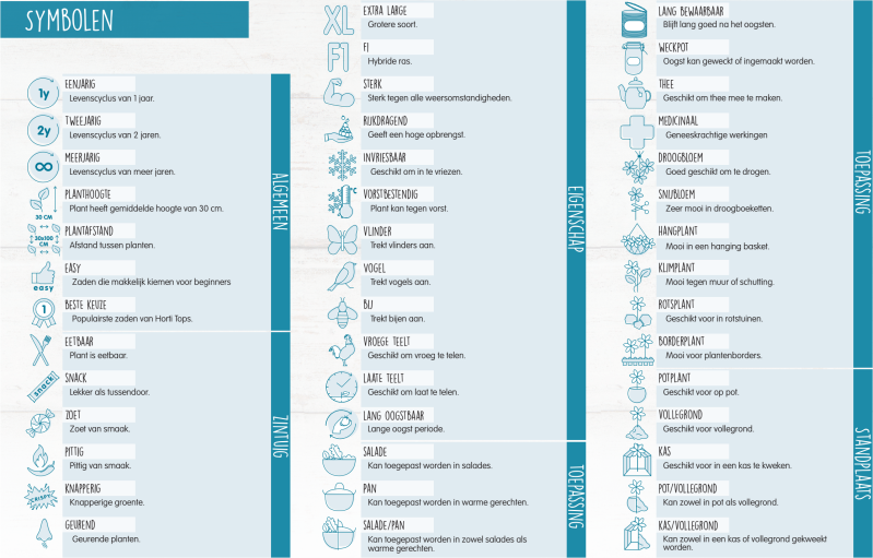 Wat betekenen de symbolen op de zakjes van de Horti Tops zaden nou eigenlijk? Hieronder staat de uitleg van alle symbolen op de Horti Tops zakjes.